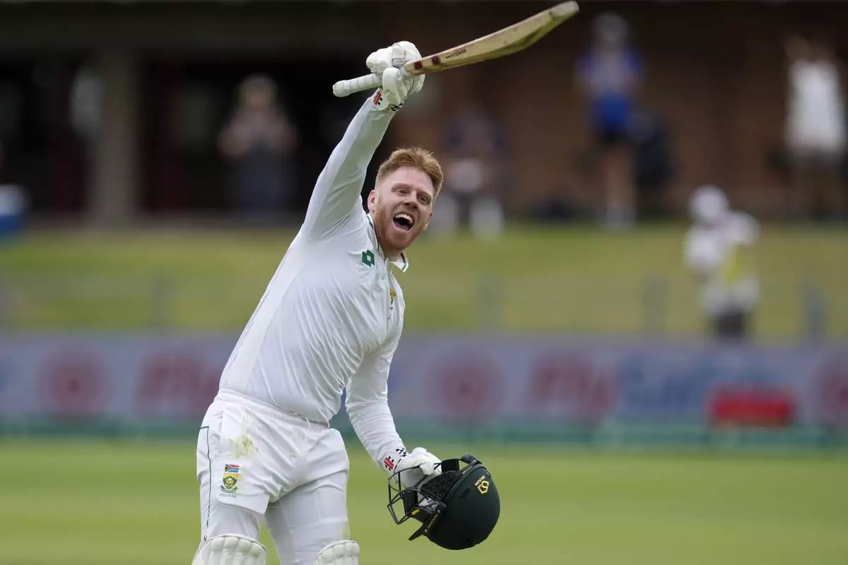 South Africa's Kyle Verreynne celebrates after scoring a century during the second day of the second test cricket match between South Africa and Sri Lanka, at St George's Park in Gqeberha, South Africa, Friday, Dec. 6, 2024. (AP Photo/Themba Hadebe)