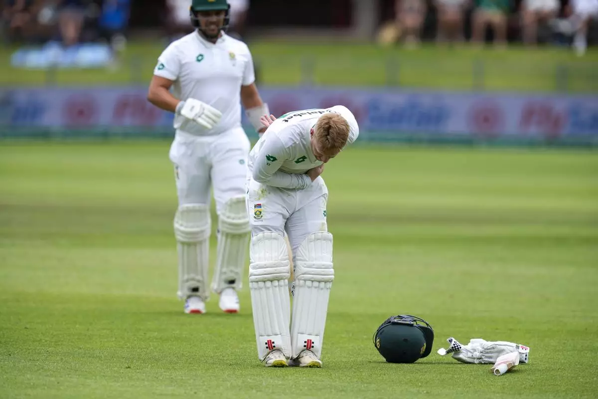 South Africa's Kyle Verreynne takes a bow in front of the players pavilion after scoring a century during the second day of the second test cricket match between South Africa and Sri Lanka, at St George's Park in Gqeberha, South Africa, Friday, Dec. 6, 2024. (AP Photo/Themba Hadebe)