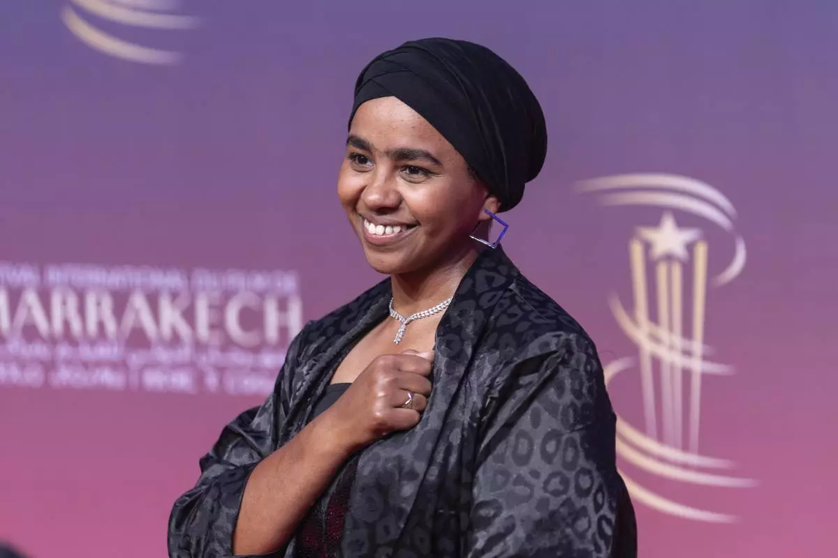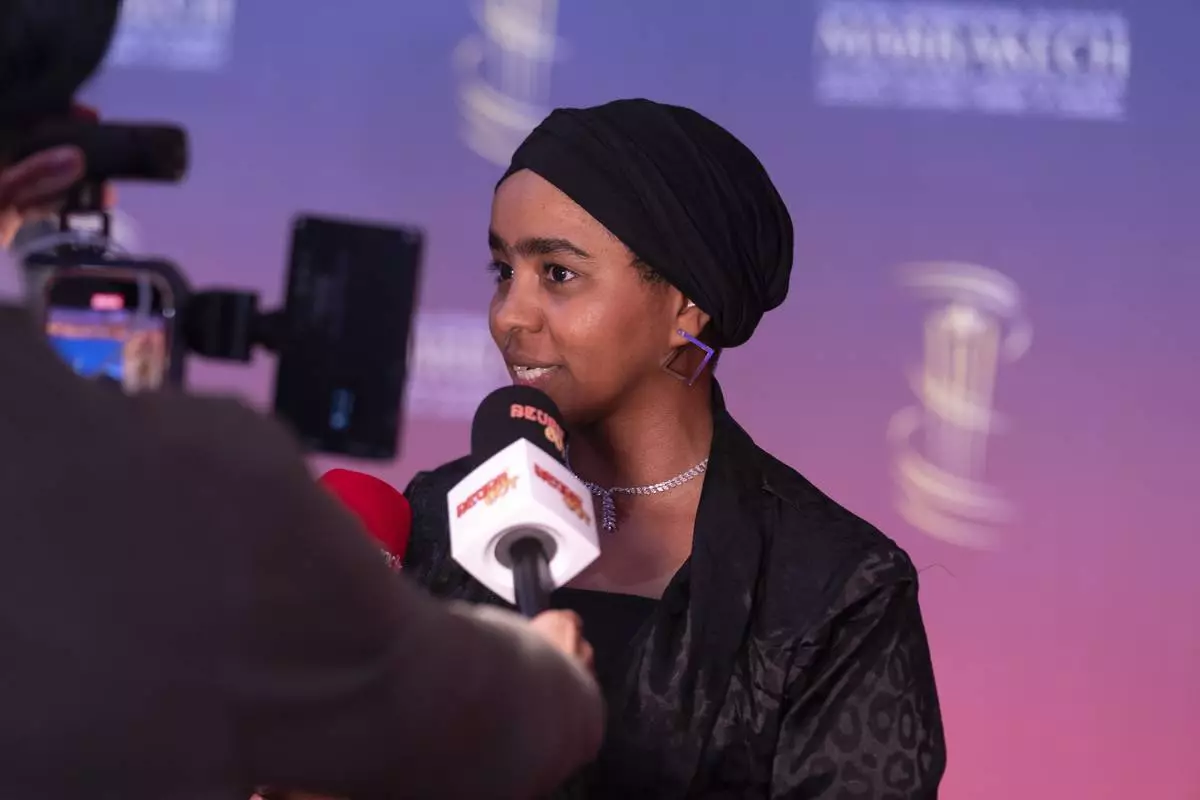 Sudanese actress Shajan Suliman gestures while attending the screening of Sudan Remember Us movie, during the Marrakech International Film Festival in Morocco, Monday, Dec. 2, 2024. (AP Photo/Mosa'ab Elshamy)
