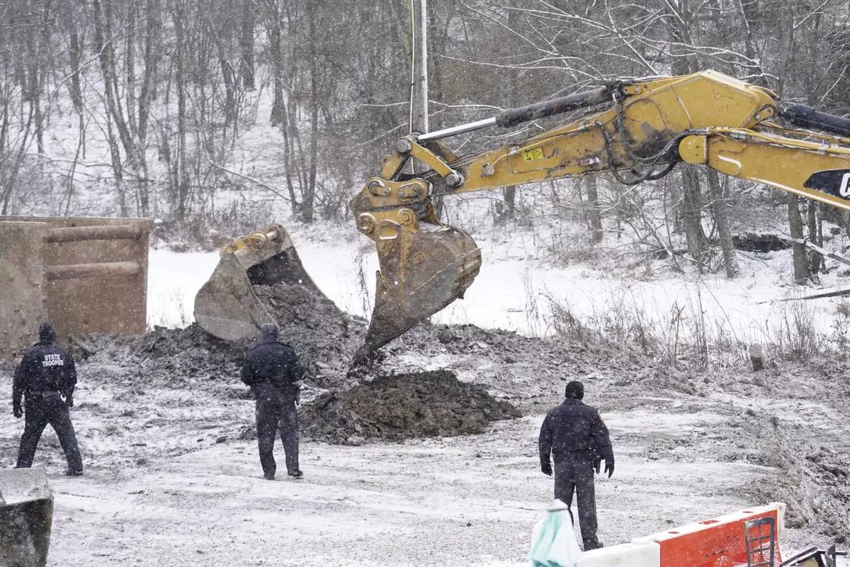 Crews work near the sinkhole where the remains of Elizabeth Pollard were found, Friday, Dec. 6, 2024 in Marguerite, Pa. (AP Photo/Matt Freed)