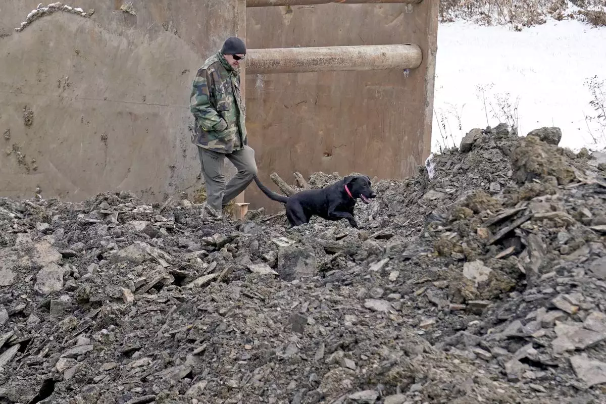A rescue dog searches though debris that was removed from a sinkhole, Thursday, Dec. 5, 2024, where rescue workers believe Elizabeth Pollard disappeared into while looking for her cat, in Marguerite, Pa. (AP Photo/Matt Freed)
