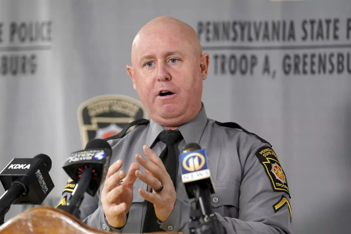 Pennsylvania State Police spokesperson Trooper Steve Limani speaks to reporters after the body of Elizabeth Pollard was recovered from sinkhole, Friday, Dec. 6, 2024, in Marguerite, Pa. (AP Photo/Matt Freed)