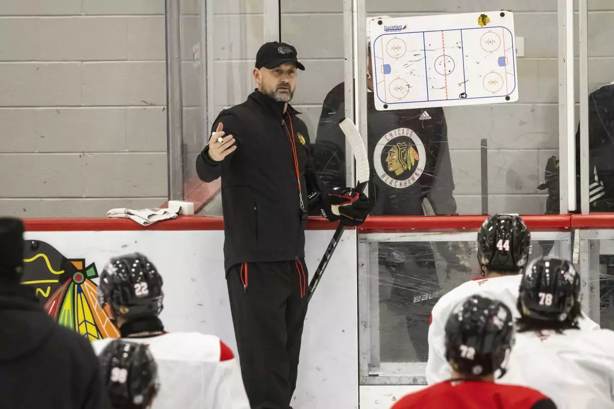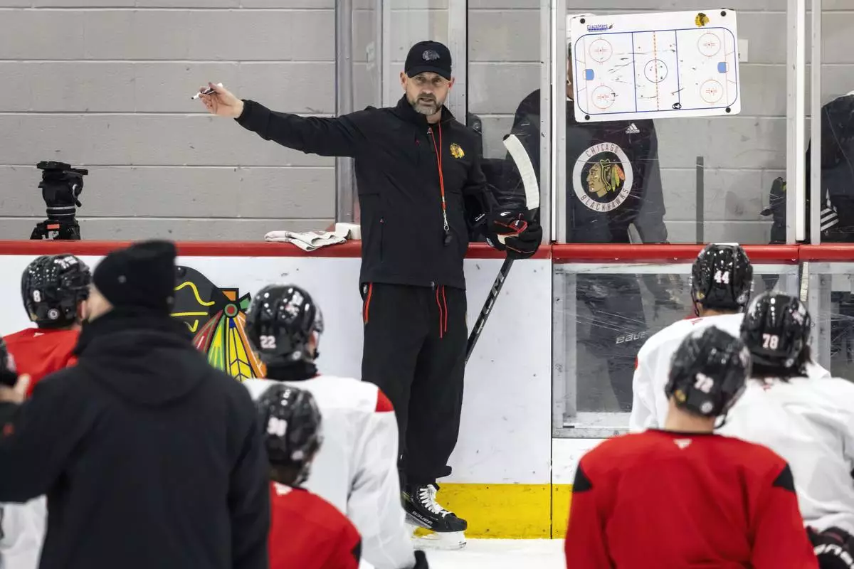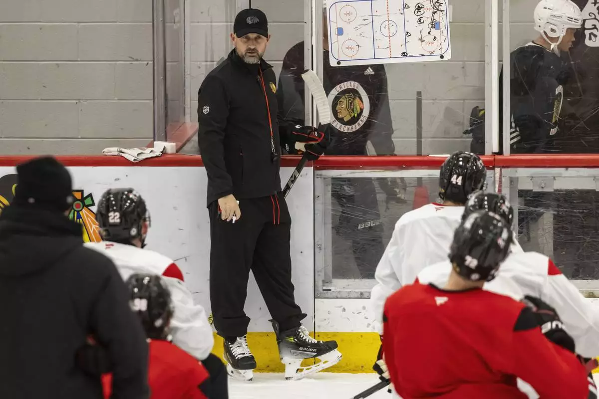 Chicago Blackhawks interim head coach Anders Sorensen directs players during NHL hockey practice at Fifth Third Arena, Friday, Dec. 6, 2024. (Ashlee Rezin/Chicago Sun-Times via AP)