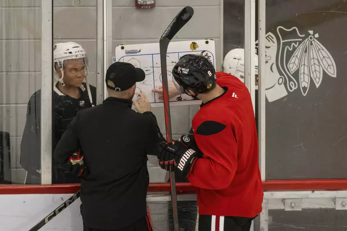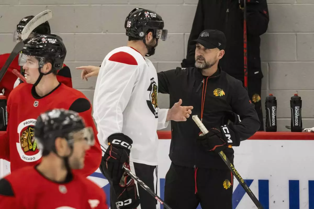 Chicago Blackhawks interim head coach Anders Sorensen speaks with Jason Dickinson (16) during NHL hockey practice at Fifth Third Arena, Friday, Dec. 6, 2024. (Ashlee Rezin/Chicago Sun-Times via AP)
