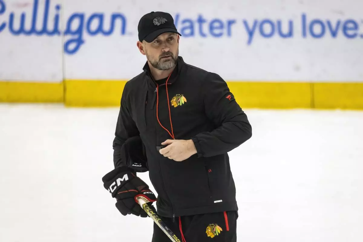 Chicago Blackhawks interim head coach Anders Sorensen skates during NHL hockey practice at Fifth Third Arena, Friday, Dec. 6, 2024. (Ashlee Rezin/Chicago Sun-Times via AP)