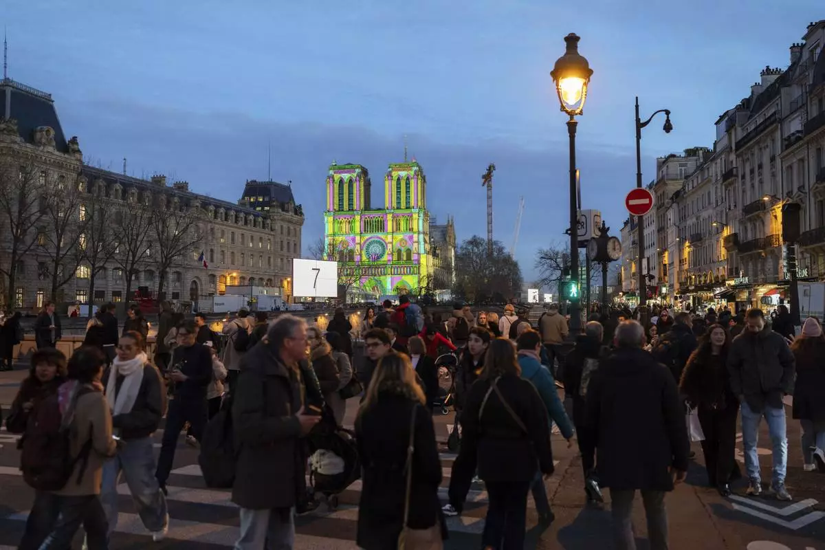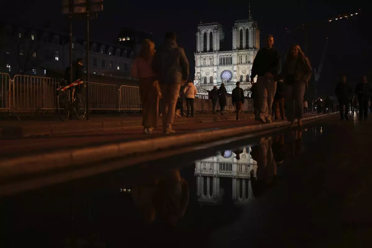 Pedestrians walk past Notre Dame Cathedral a day before its ceremonial reopening in Paris on Friday, Dec. 6, 2024, following the devastating fire of 2019. (AP Photo/Bernat Armangue)