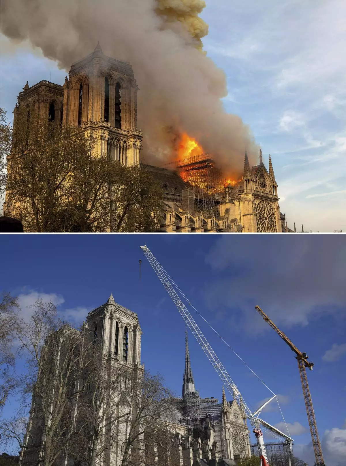A combo of images shows Notre Dame cathedral burning in Paris, Monday April 15, 2019, top, and a view of the cathedral following restoration works in Paris, on Dec. 3, 2024. (AP Photo/Vanessa Pena, Thibault Camus)