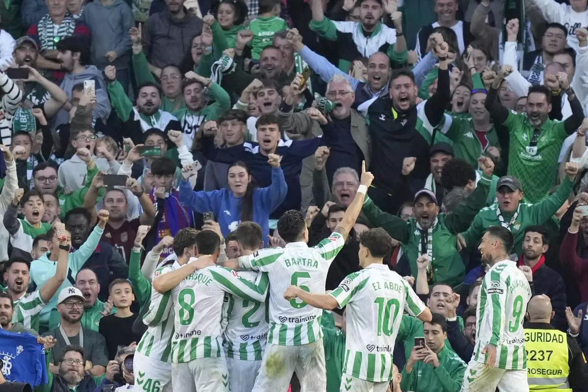 Real Betis players celebrate after Betis' Assane Diao scored his side's second goal during a Spanish La Liga soccer match between Betis and Barcelona at the Benito Villamarin stadium in Seville, Spain, Saturday, Dec. 7, 2024. (AP Photo/Jose Breton)
