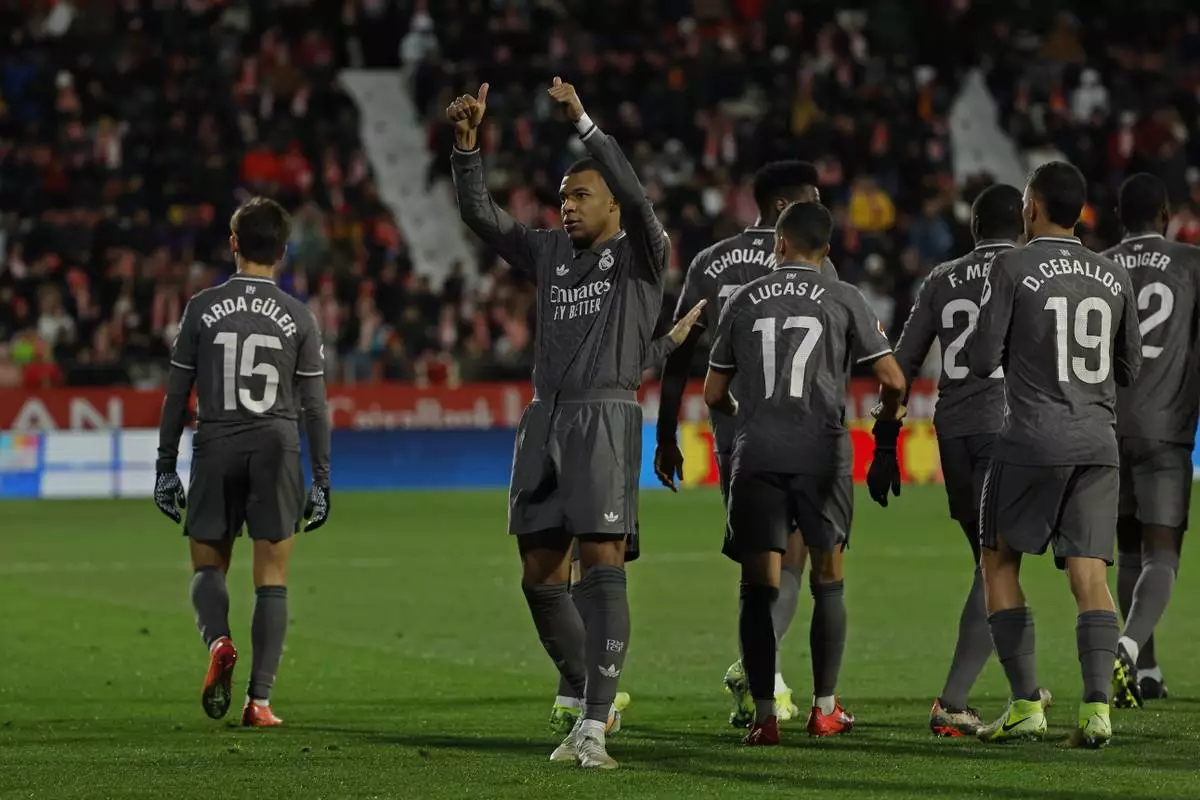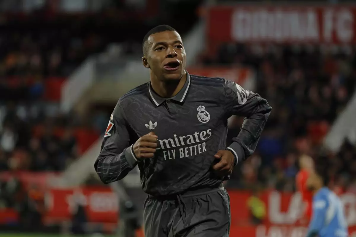 Real Madrid's Kylian Mbappe reacts after scoring his side's third goal during a Spanish La Liga soccer match between Girona and Real Madrid at the Montilivi stadium in Girona, Spain, Saturday, Dec. 7, 2024. (AP Photo/Joan Monfort)