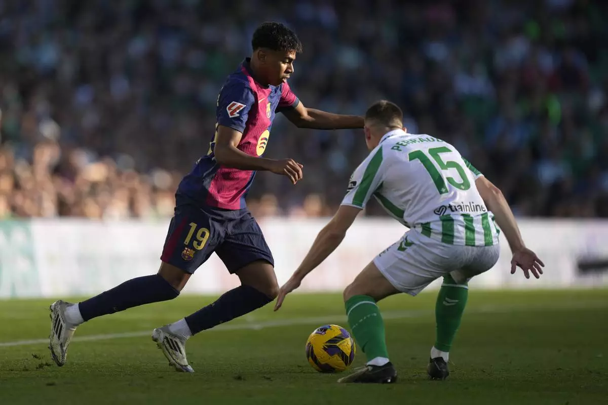 Barcelona's Lamine Yamal, left, challenges for the ball with Betis' Romain Perraud during a Spanish La Liga soccer match between Betis and Barcelona at the Benito Villamarin stadium in Seville, Spain, Saturday, Dec. 7, 2024. (AP Photo/Jose Breton)