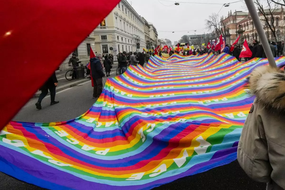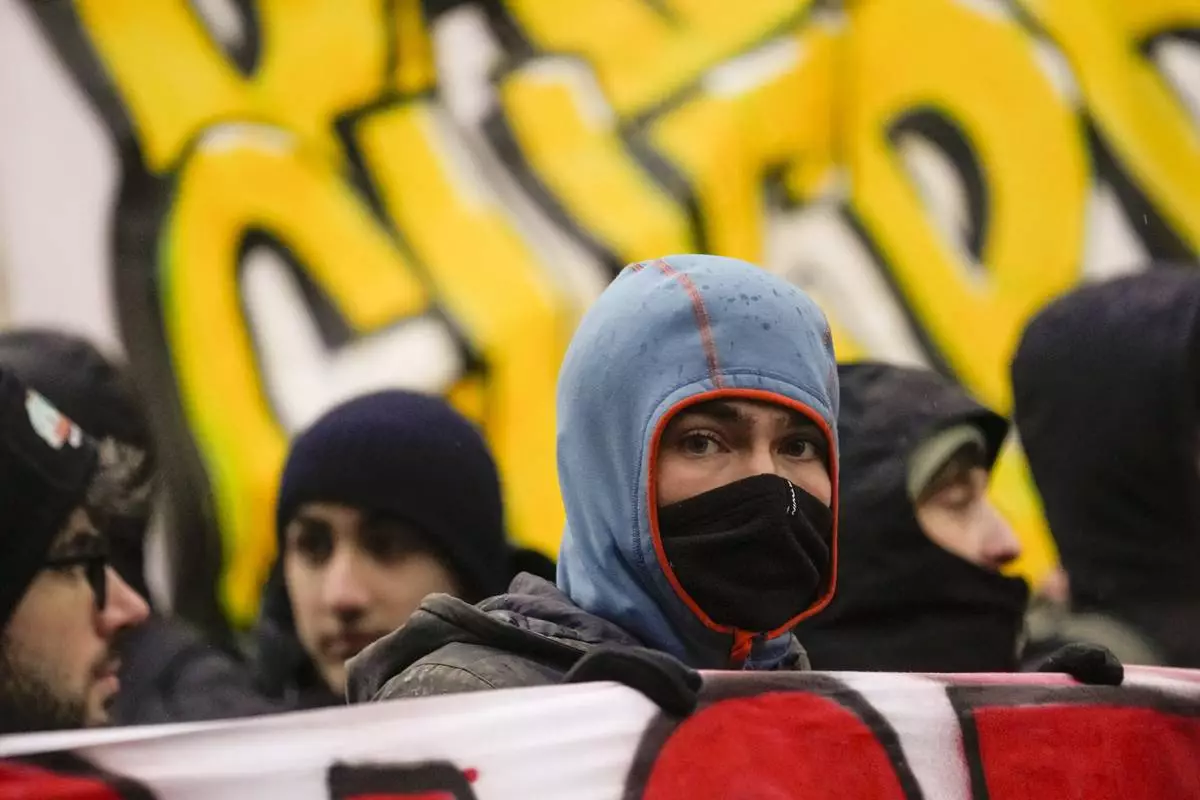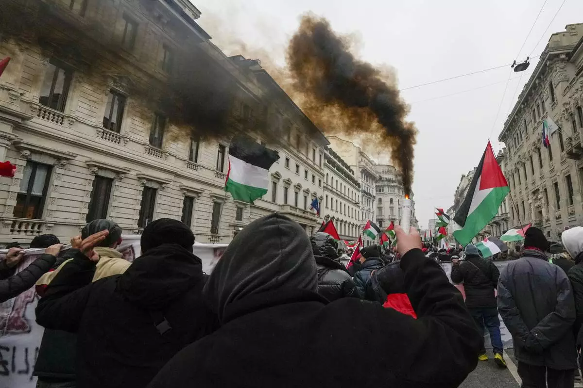 People take to the street in MIlan, Saturday, Dec. 7, 2024, to protest against ongoing wars and a security bill being discussed in the parliament that would introduce new rules about public demonstrations and the right to strike. (AP Photo/Luca Bruno)