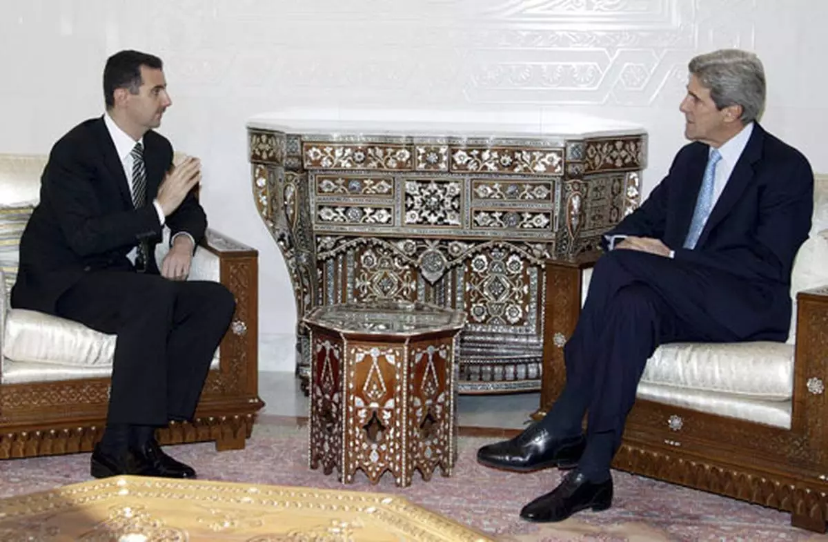 FILE - Syrian President Bashar Assad, left, talks with former US presidential candidate Senator John Kerry in Damascus, Jan. 8, 2004. (SANA via AP, File)