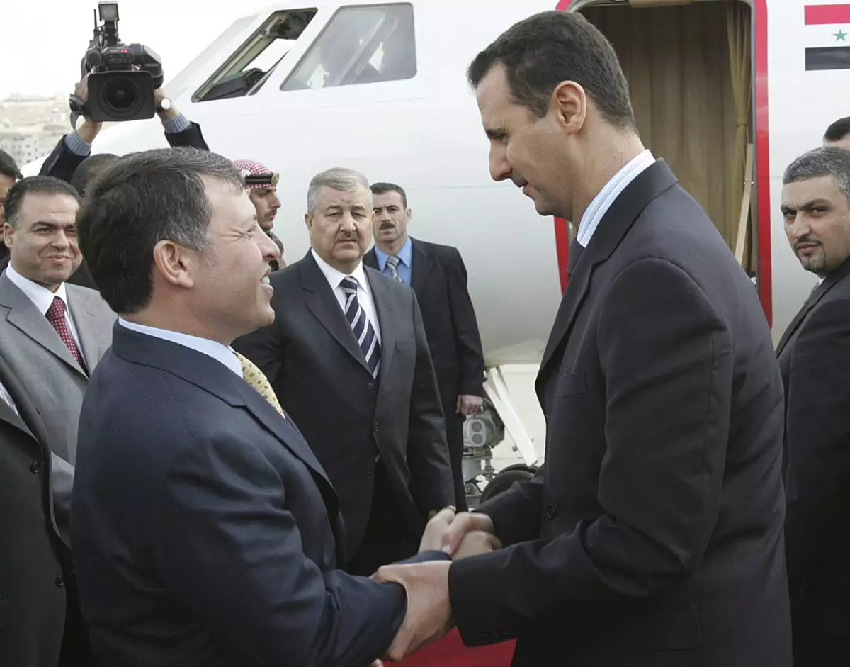 FILE - Jordan's King Abdullah II, left, shakes hands with Syrian President Bashar Assad, as he sees him off at Marka military airport in Amman, Jordan, Feb. 2, 2005. (AP Photo/Hussein Malla, File)