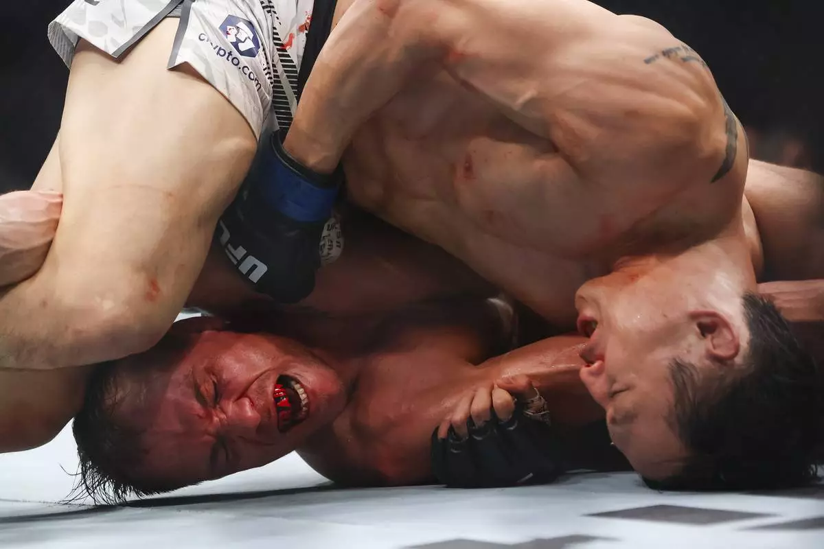 Pantoja’s far superior skills on the mat outweighed Asakura’s hard-hitting reputation. After a brief scramble to better position himself, Pantoja got Asakura’s back, put him in a body triangle, and then choked him out.