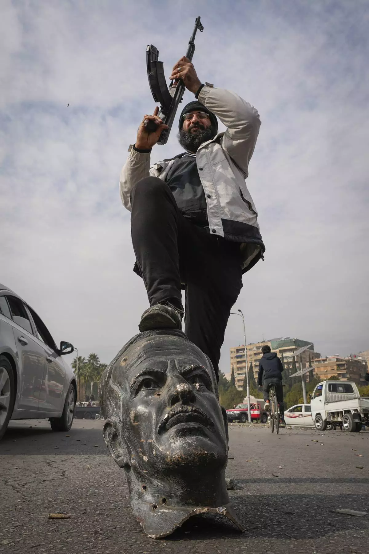 An opposition fighter steps on a broken bust of the late Syrian President Hafez Assad in Damascus, Syria, Sunday Dec. 8, 2024. (AP Photo/Hussein Malla)