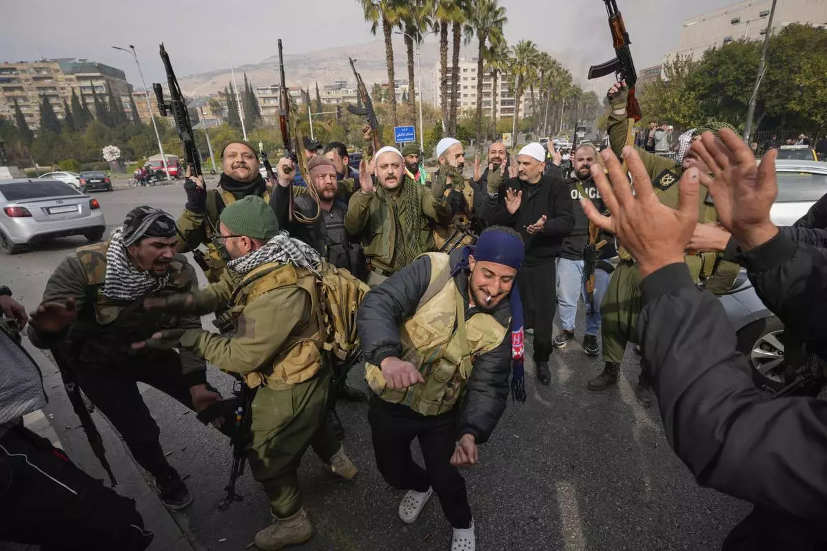 Opposition fighters celebrate in Damascus, Syria, Sunday Dec. 8, 2024. (AP Photo/Hussein Malla)
