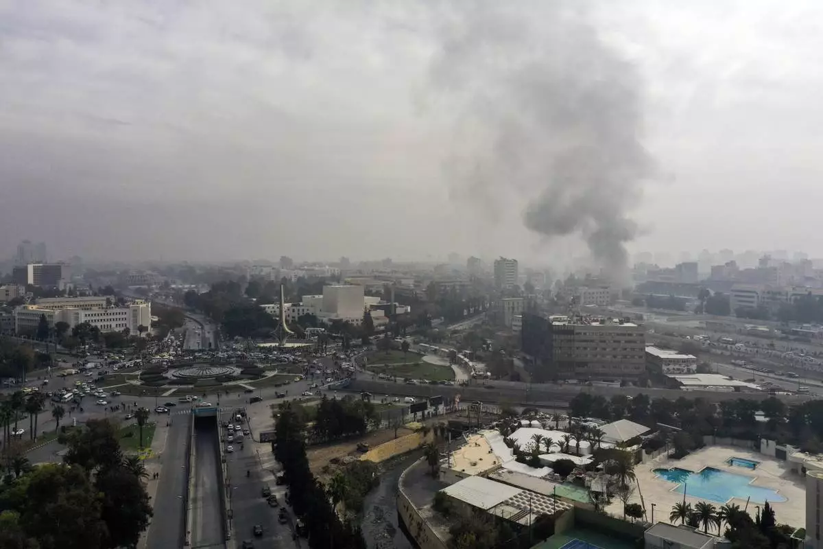Smoke billows in the background as residents and opposition fighters celebrate in a central square after opposition forces took control of the city in Damascus, Syria, Sunday, Dec. 8, 2024. (AP Photo/Ghaith Alsayed)