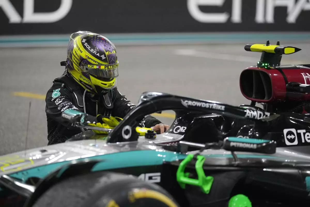 Mercedes driver Lewis Hamilton of Britain reacts after the Formula One Abu Dhabi Grand Prix at the Yas Marina Circuit in Abu Dhabi, UAE, Sunday, Dec. 8, 2024. (AP Photo/Darko Bandic)