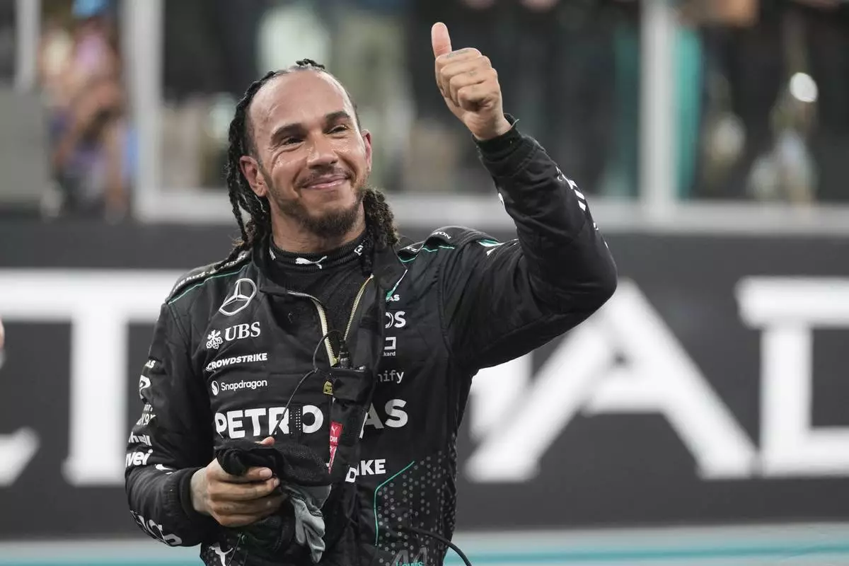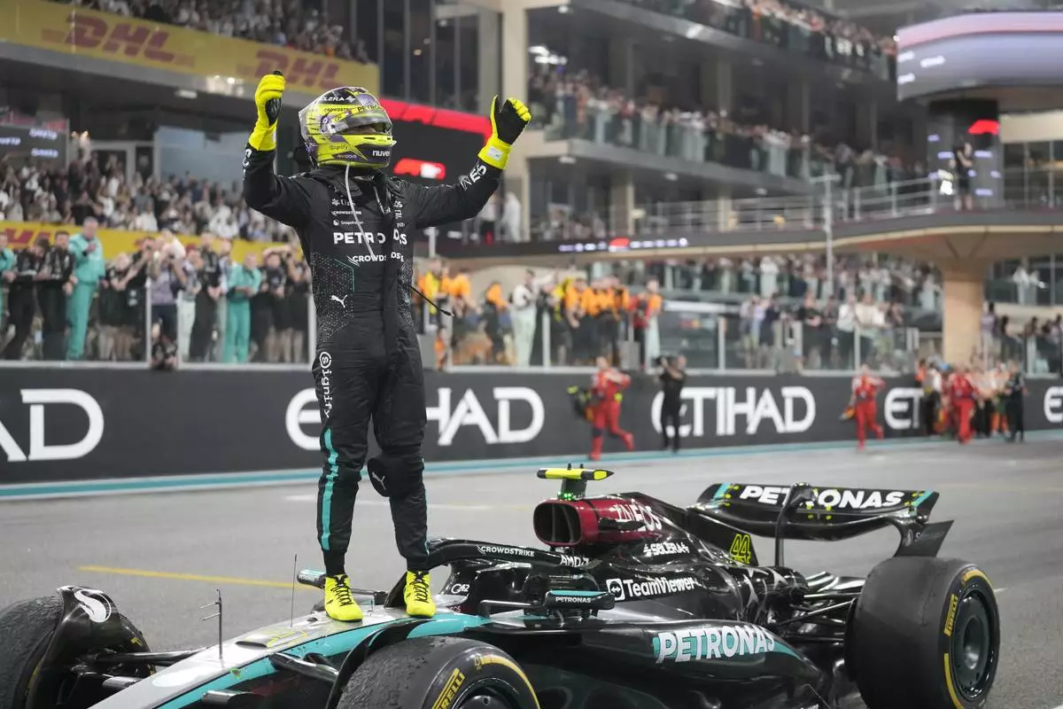 Lewis Hamilton of Britain reacts after his last race for the Mercedes team after the Formula One Abu Dhabi Grand Prix at the Yas Marina Circuit in Abu Dhabi, UAE, Sunday, Dec. 8, 2024. (AP Photo/Darko Bandic)