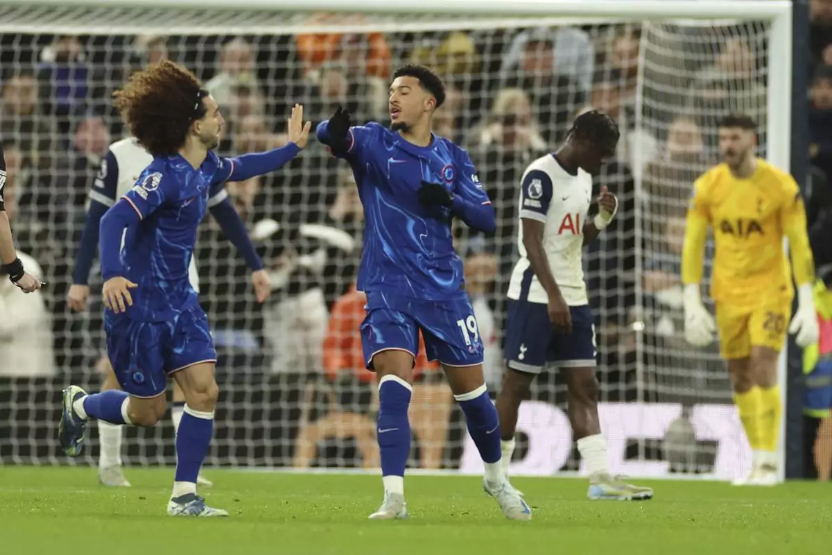 Chelsea's Jadon Sancho celebrates with his teammate Marc Cucurella after scoring his side's first goal during the English Premier League soccer match between Tottenham Chelsea, at the Hotspur stadium in London, Sunday, Dec.8, 2024. (AP Photo/Ian Walton)
