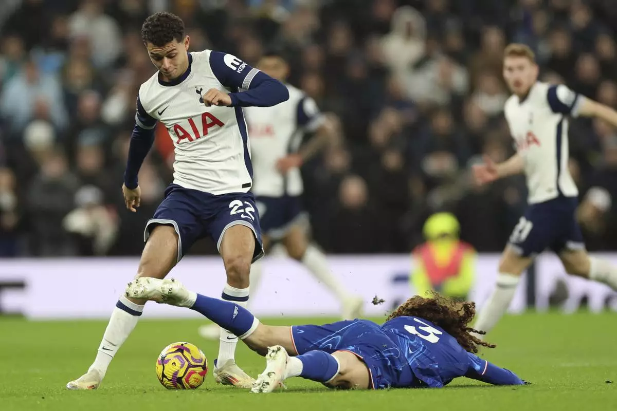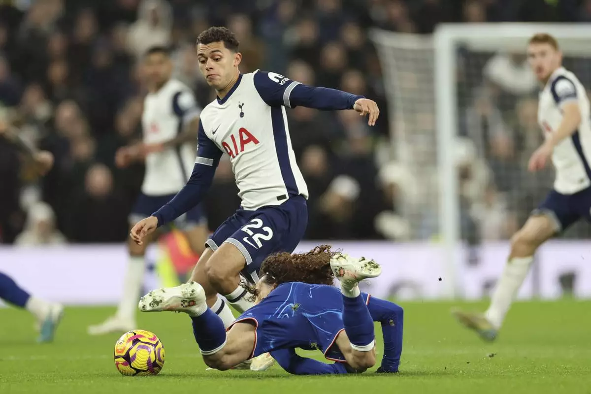 Tottenham's Brennan Johnson challenges for the ball with Chelsea's Marc Cucurella during the English Premier League soccer match between Tottenham Chelsea, at the Hotspur stadium in London, Sunday, Dec.8, 2024. (AP Photo/Ian Walton)