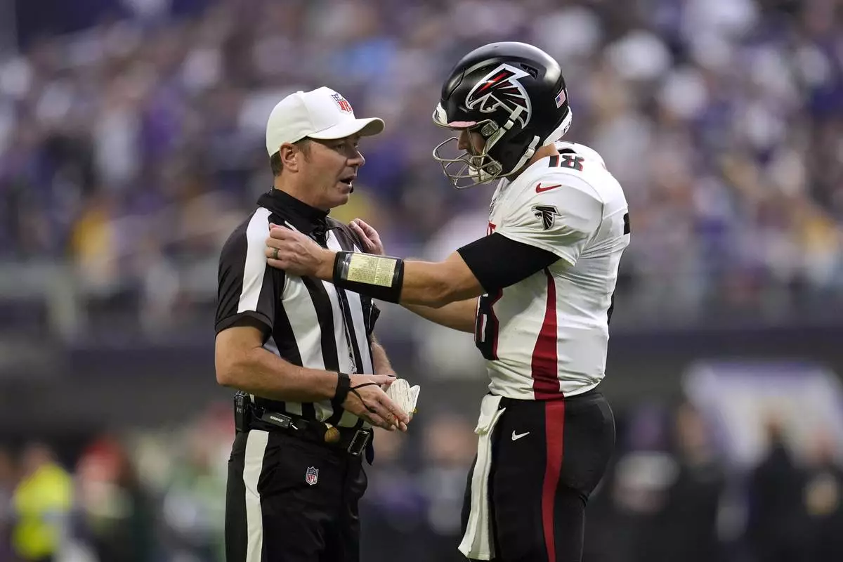 Atlanta Falcons quarterback Kirk Cousins talks with referee Alex Kemp, left, during the first half of an NFL football game against the Minnesota Vikings, Sunday, Dec. 8, 2024, in Minneapolis. (AP Photo/Abbie Parr)
