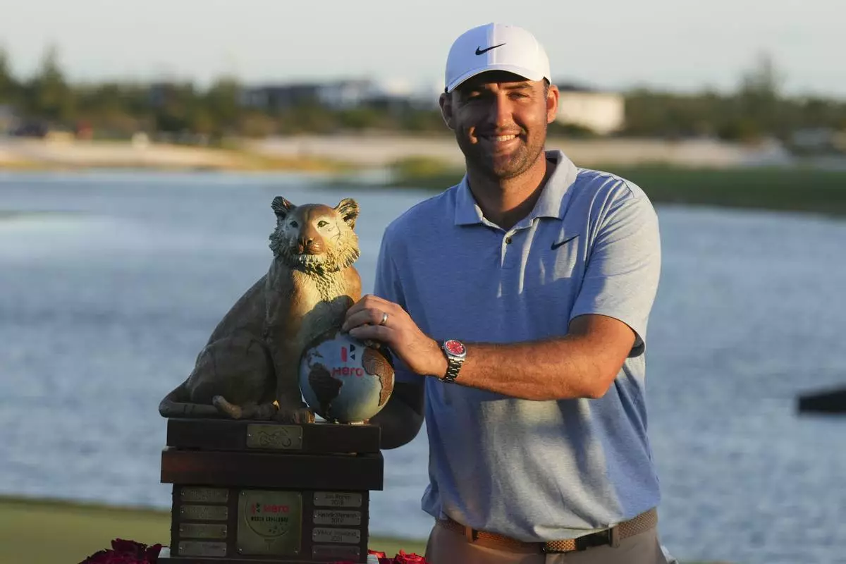 Scottie Scheffler, of the United States, poses with the championship trophy after the final round of the Hero World Challenge PGA Tour at the Albany Golf Club in New Providence, Bahamas, Sunday, Dec. 8, 2024. (AP Photo/Fernando Llano)