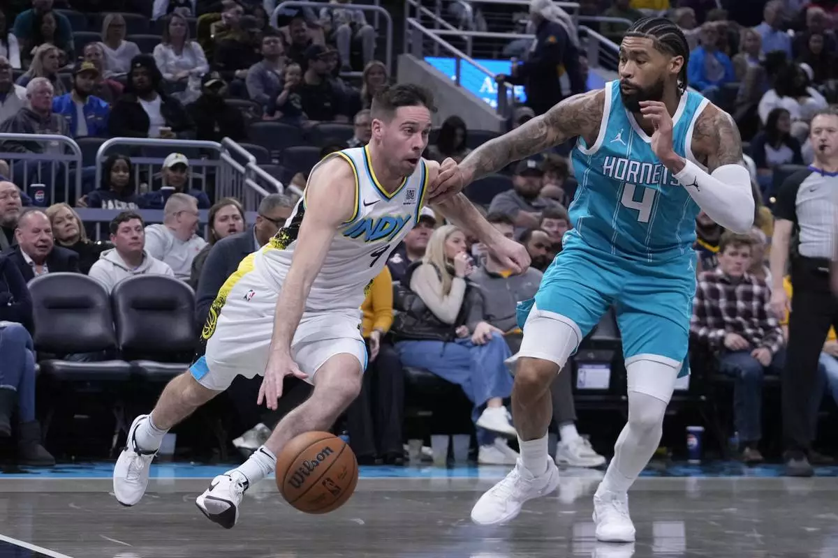 Indiana Pacers' T.J. McConnell (9) shoots over Charlotte Hornets' Isaiah Wong (21) during the second half of an NBA basketball game, Sunday, Dec. 8, 2024, in Indianapolis. (AP Photo/Darron Cummings)