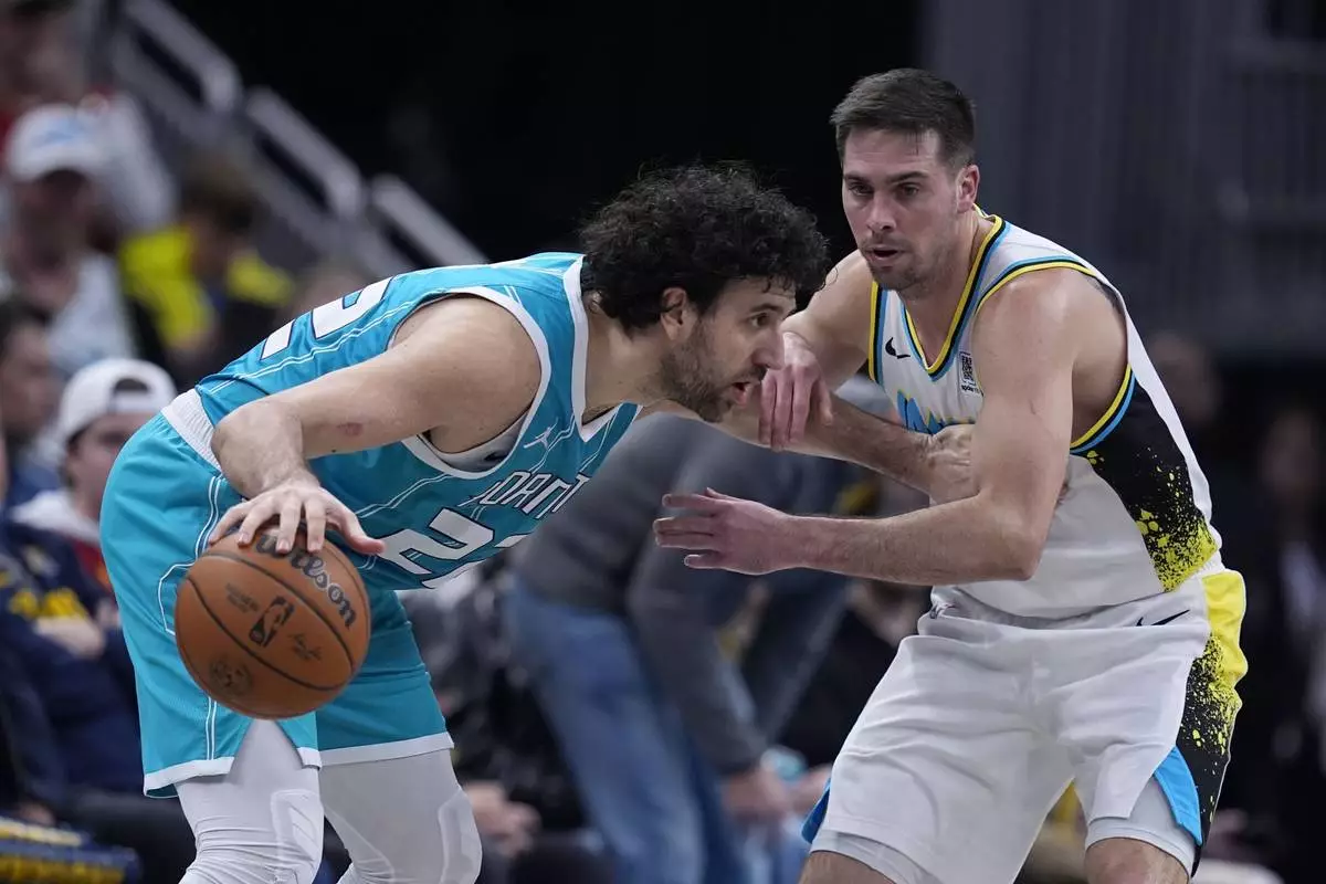 Charlotte Hornets' Vasilije Micic is defended by Indiana Pacers' T.J. McConnell (9) during the second half of an NBA basketball game, Sunday, Dec. 8, 2024, in Indianapolis. (AP Photo/Darron Cummings)