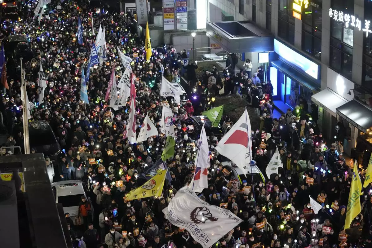 Participants march to the headquarters of the ruling People Power Party during a rally to demand South Korean President Yoon Suk Yeol's impeachment, in Seoul, South Korea, Monday, Dec. 9, 2024. (AP Photo/Ahnn Young-joon)