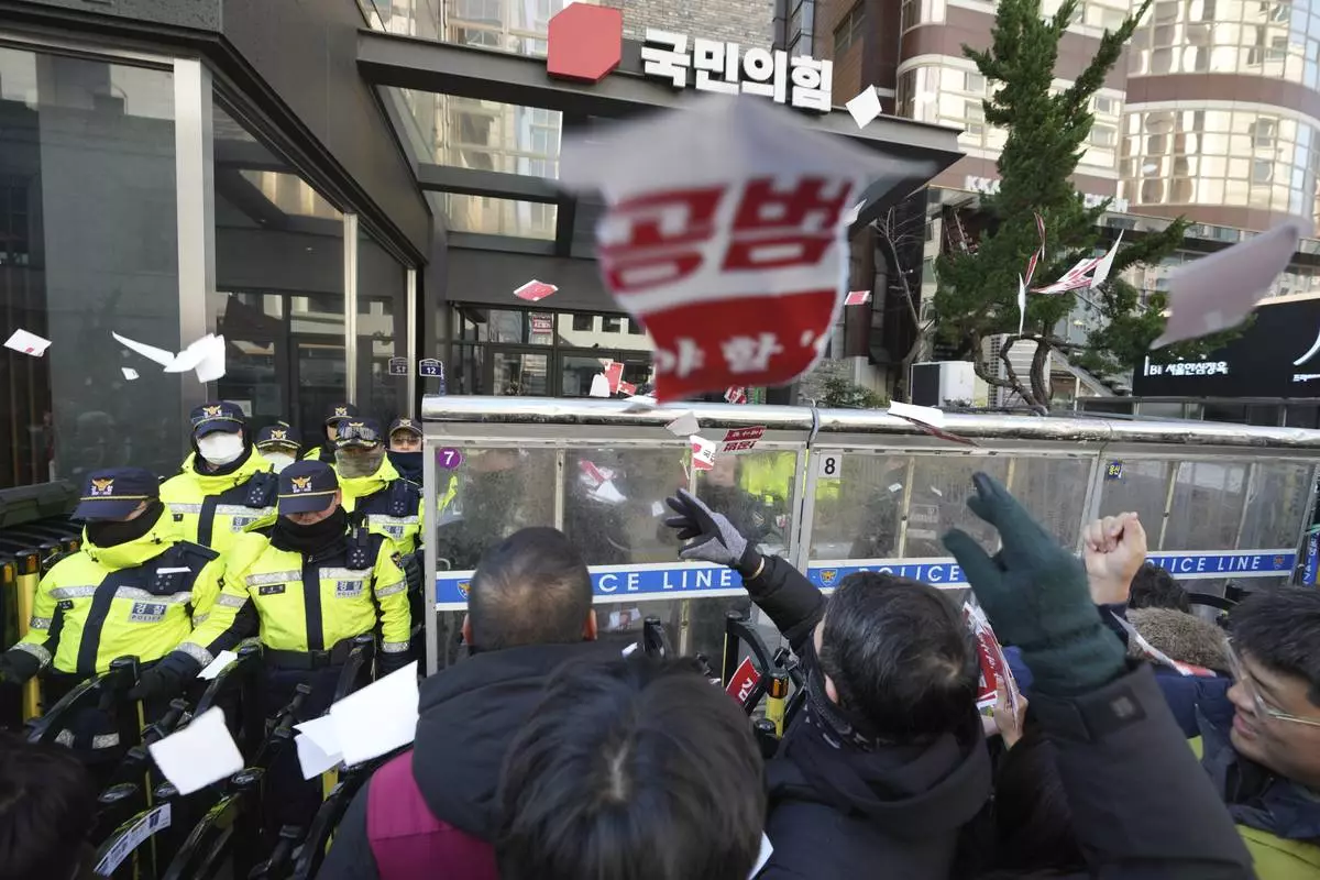 Participants stage a rally to demand South Korean President Yoon Suk Yeol's impeachment in front of the headquarters of the ruling People Power Party, in Seoul, South Korea, Monday, Dec. 9, 2024. (AP Photo/Ahnn Young-joon)
