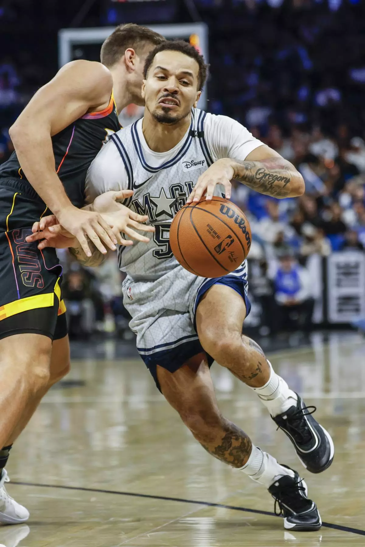 Orlando Magic guard Cole Anthony, right, is fouled by Phoenix Suns guard Grayson Allen, left, during the first half of an NBA basketball game, Sunday, Dec. 8, 2024, in Orlando, Fla. (AP Photo/Kevin Kolczynski)