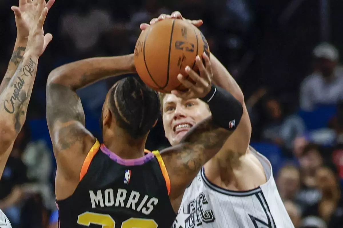 Orlando Magic center Moritz Wagner, right, defends Phoenix Suns guard Monte Morris, left, during the first half of an NBA basketball game, Sunday, Dec. 8, 2024, in Orlando, Fla. (AP Photo/Kevin Kolczynski)