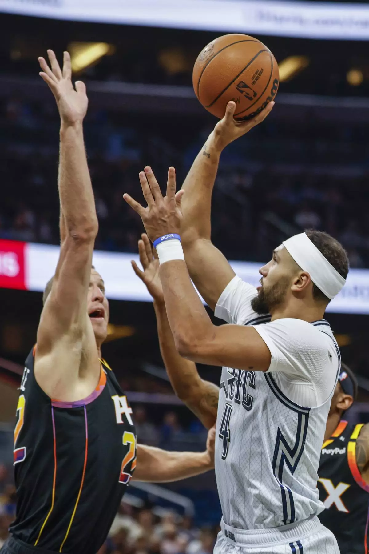 Orlando Magic guard Jalen Suggs shoots over the Phoenix Suns center Mason Plumlee, left, during the first half of an NBA basketball game, Sunday, Dec. 8, 2024, in Orlando, Fla. (AP Photo/Kevin Kolczynski)