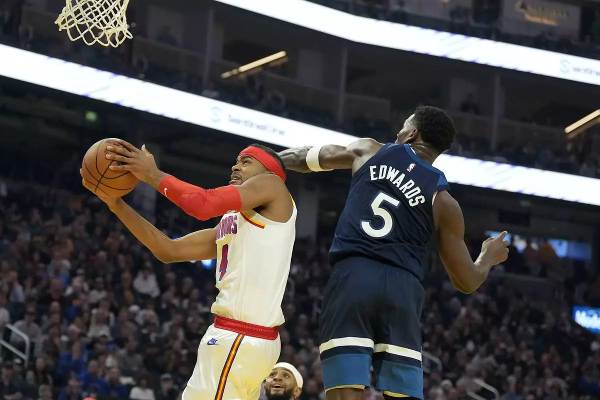 Golden State Warriors guard Moses Moody (4) drives to the basket against Minnesota Timberwolves guard Anthony Edwards (5) during the first half of an NBA basketball game in San Francisco, Sunday, Dec. 8, 2024. (AP Photo/Tony Avelar)