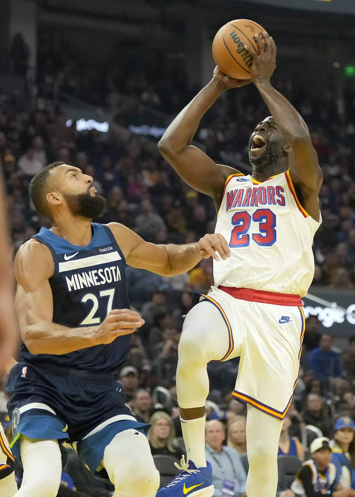Golden State Warriors forward Draymond Green (23) shoots over Minnesota Timberwolves center Rudy Gobert (27) during the first half of an NBA basketball game in San Francisco, Sunday, Dec. 8, 2024. (AP Photo/Tony Avelar)