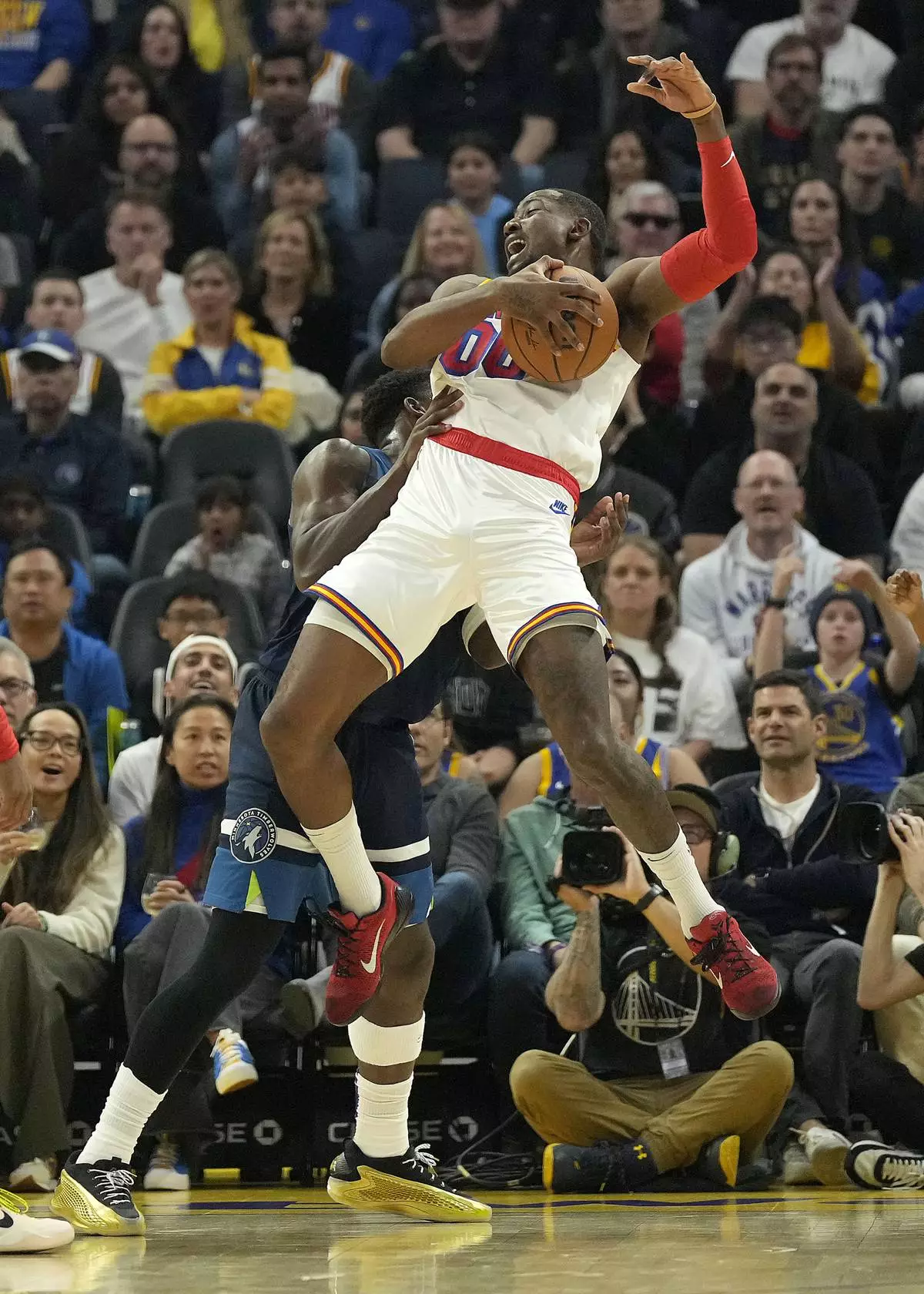 Golden State Warriors forward Jonathan Kuminga (00) reacts as he is fouled by Minnesota Timberwolves guard Anthony Edwards, left, during the first half of an NBA basketball game in San Francisco, Sunday Dec. 8, 2024. (AP Photo/Tony Avelar)