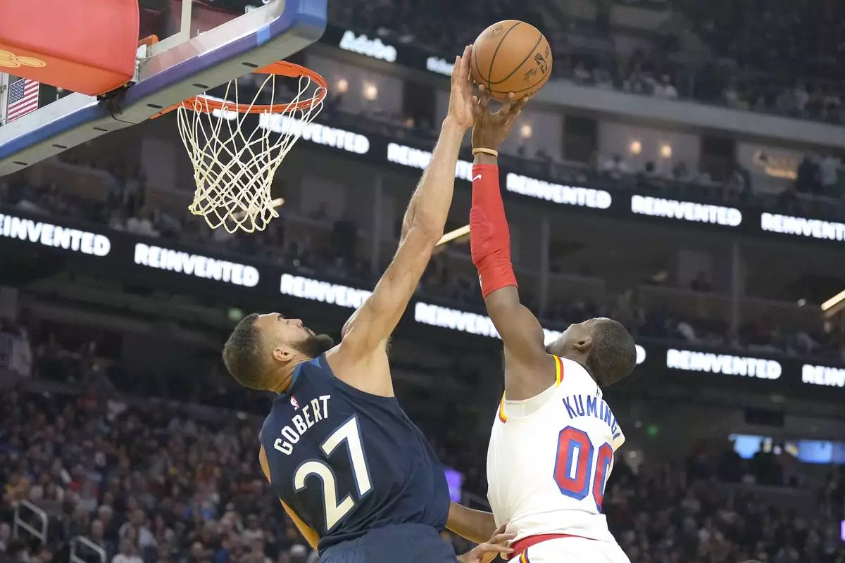 Minnesota Timberwolves center Rudy Gobert (27) blocks a shot-attempt by Golden State Warriors forward Jonathan Kuminga (00) during the first half of an NBA basketball game in San Francisco, Sunday Dec. 8, 2024. (AP Photo/Tony Avelar)