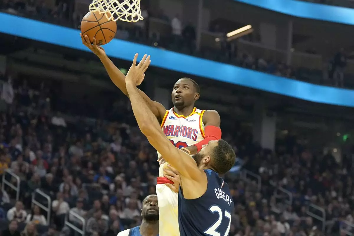 Golden State Warriors forward Jonathan Kuminga, top, drives to the basket against Minnesota Timberwolves center Rudy Gobert (27) during the first half of an NBA basketball game in San Francisco, Sunday, Dec. 8, 2024. (AP Photo/Tony Avelar)