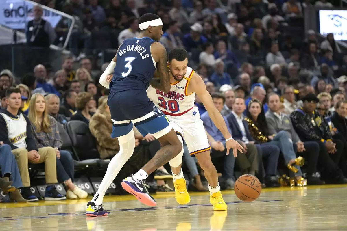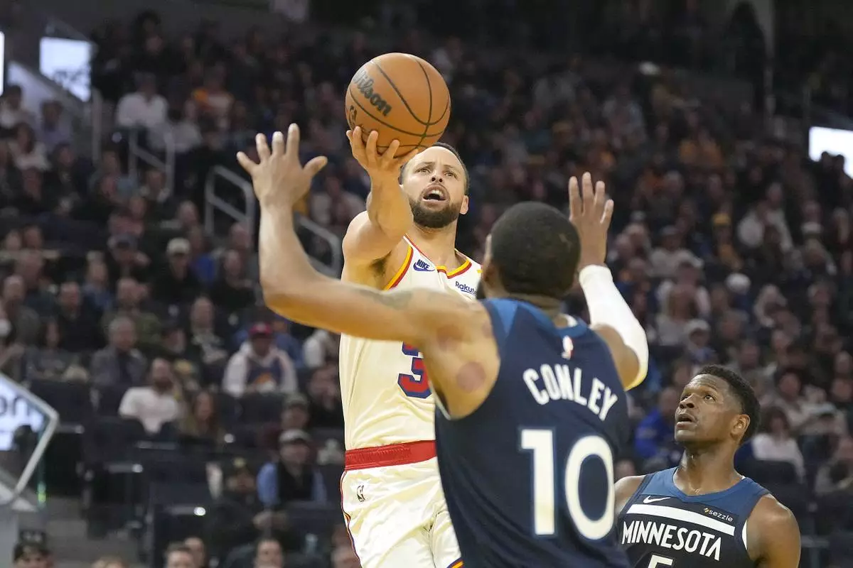 SAN FRANCISCO (AP) — Stephen Curry sunk a 39-foot jumper from nearly halfcourt to beat the third-quarter buzzer and finished with 30 points and eight assists, leading the Golden State Warriors past the Minnesota Timberwolves 114-106 on Sunday night in the teams' second meeting over three days.