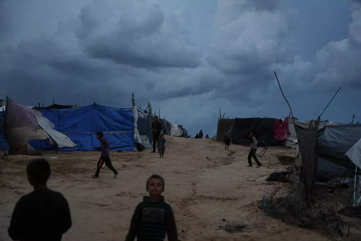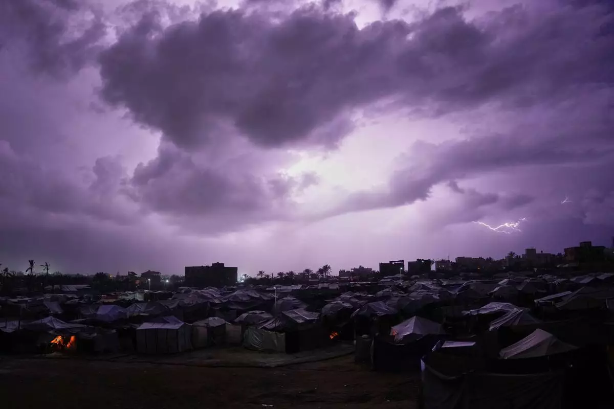 A thunderstorm is seen over a tent camp for displaced Palestinians in Zawaida, central Gaza Strip, Wednesday, Dec. 10, 2025. (AP Photo/Abdel Kareem Hana)