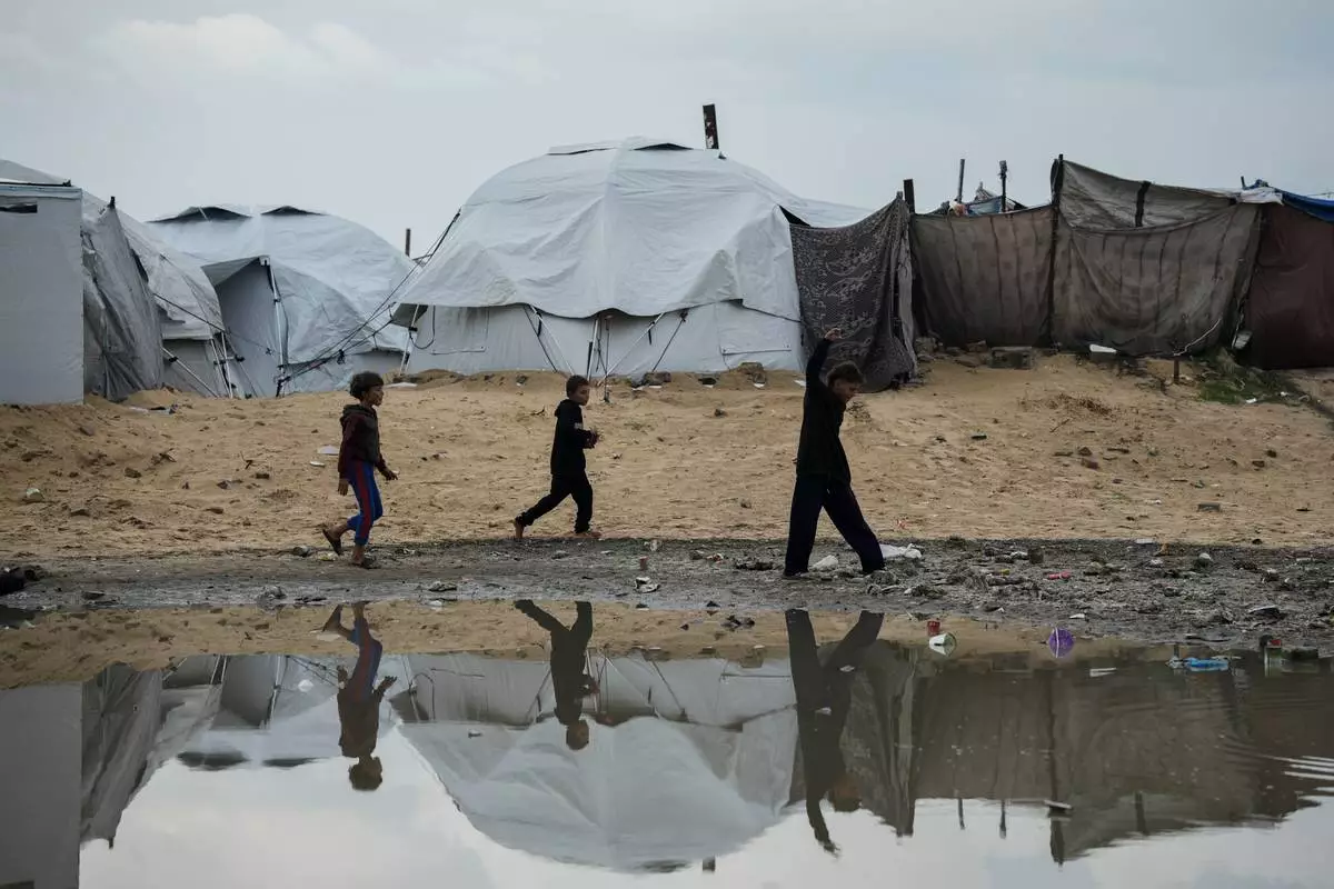 Displaced Palestinian children walk through a tent camp after stormy weather in Gaza City Wednesday, Dec. 10, 2025. (AP Photo/Jehad Alshrafi)