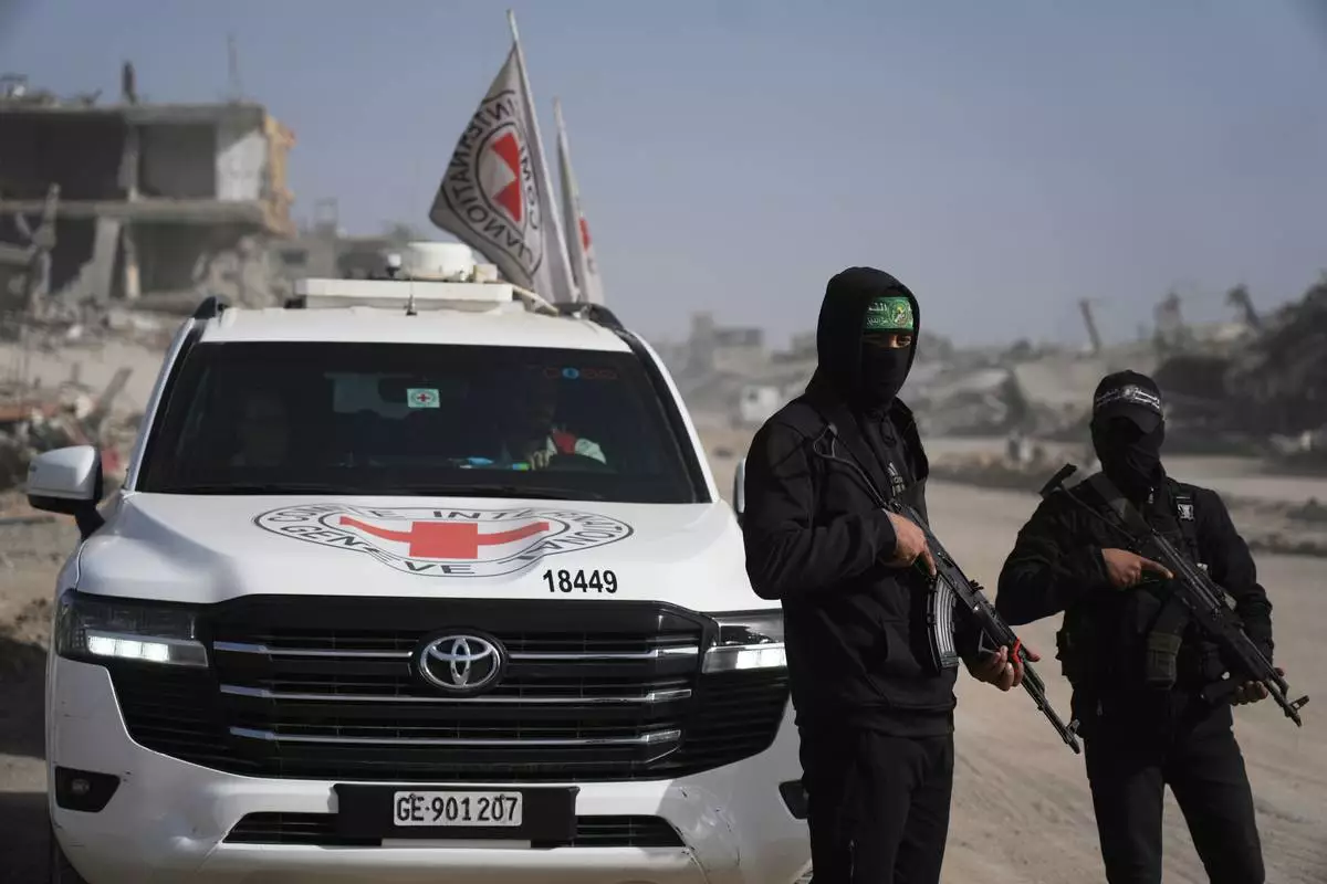 FILE - Hamas militants accompanied by members of the International Committee of the Red Cross (ICRC) head to Zeitoun neighborhood of Gaza City to search for the remains of the final hostage, Dec. 8, 2025. (AP Photo/Jehad Alshrafi, File)