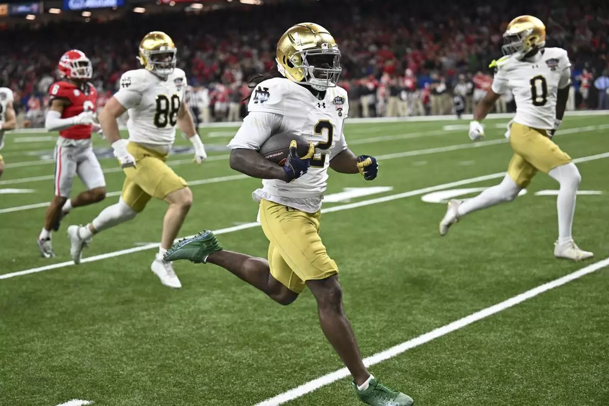 Notre Dame's Jayden Harrison (2) returns a kickoff 98 yards for a touchdown during the second half against Georgia in the quarterfinals of a College Football Playoff, Thursday, Jan. 2, 2025, in New Orleans. (AP Photo/Matthew Hinton)