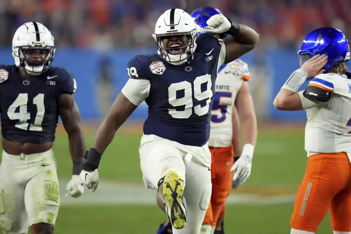 Penn State defensive tackle Coziah Izzard (99) celebrates a defensive stop against Boise State during the second half of the Fiesta Bowl College Football Playoff game, Tuesday, Dec. 31, 2024, in Glendale, Ariz. (AP Photo/Ross D. Franklin)