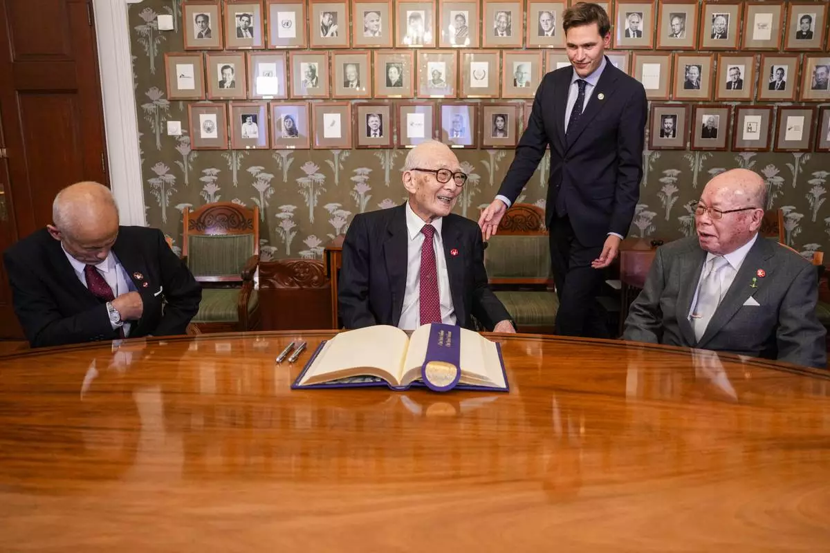 Representatives of this year's Nobel Peace Prize winner Nihon Hidankyo, or the Japan Confederation of A- and H-Bomb Sufferers Organizations, from left; Toshiyuki Mimaki, Terumi Tanaka and Shigemitsu Tanaka, sign the guest book ahead of the Nobel Peace Prize ceremony, at the Nobel Institute in Oslo, on Monday, Dec. 9, 2024. (Javad Parsa/NTB Scanpix via AP)