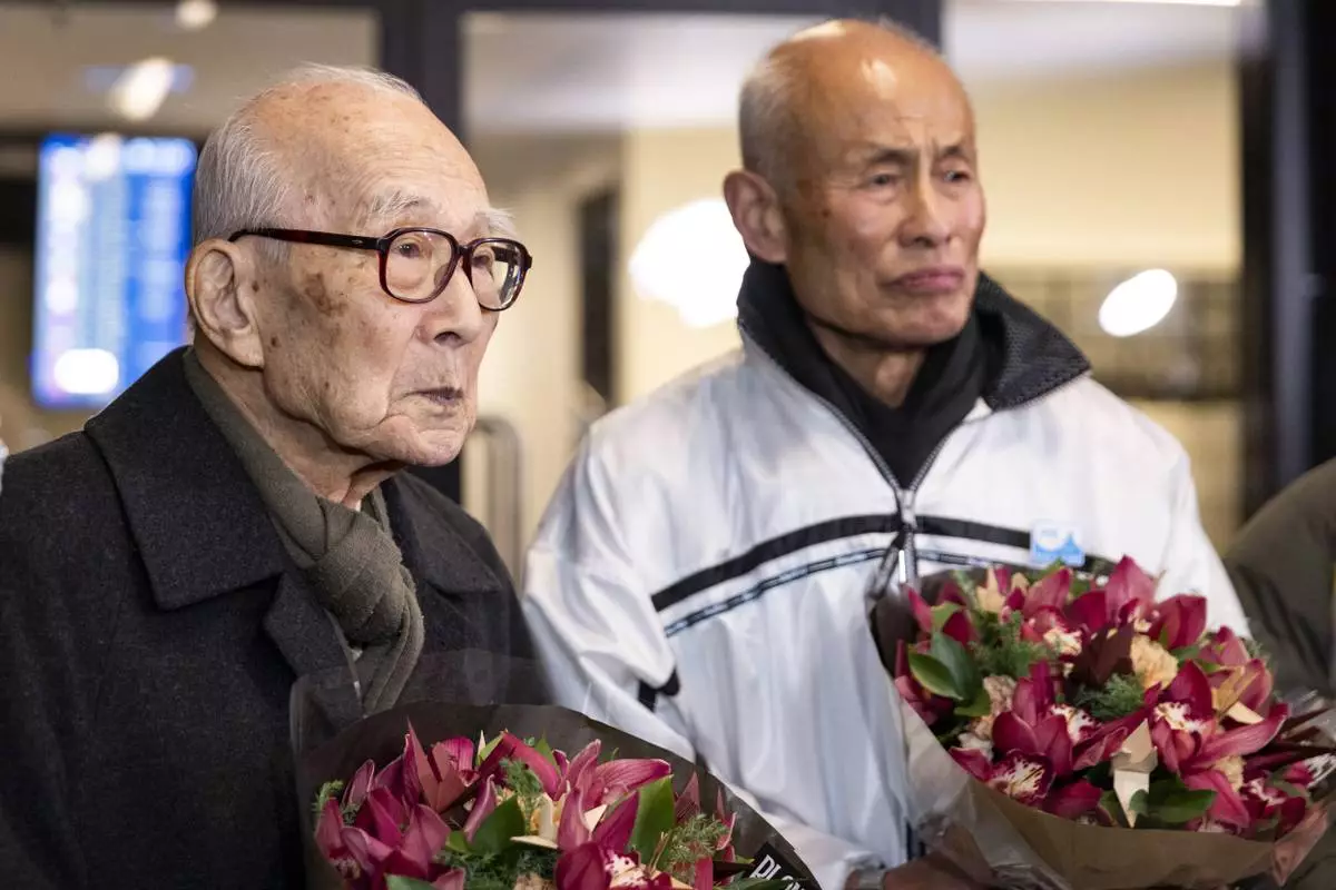 Representatives of this year's Nobel Peace Prize winner Nihon Hidankyo Terumi Tanaka, left, and Toshiyuki Mimaki arrive in Gardermoen, Norway Sunday evening, Dec. 8, 2024. (Amanda Pedersen Giske/NTB Scanpix via AP)