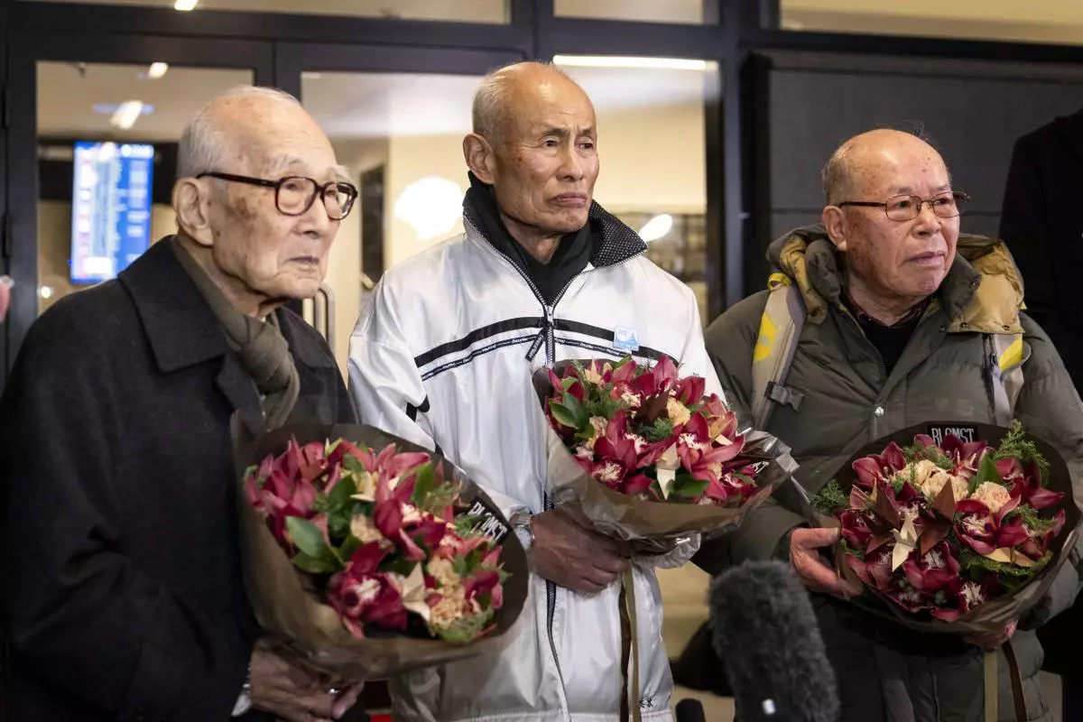 Representatives of this year's Nobel Peace Prize winner Nihon Hidankyo, from left, Terumi Tanaka, Toshiyuki Mimaki and Shigemitsu Tanaka arrive in Gardermoen, Norway Sunday evening, Dec. 8, 2024. (Amanda Pedersen Giske/NTB Scanpix via AP)