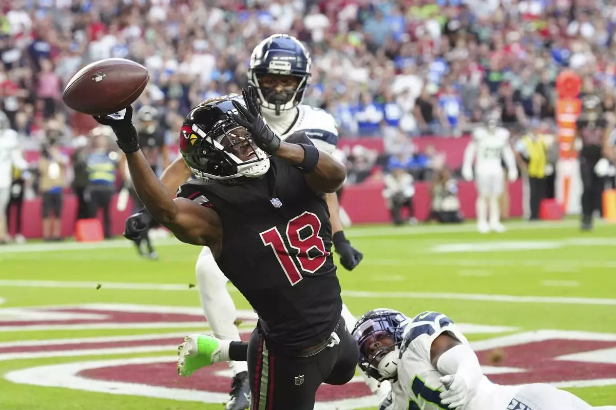 Arizona Cardinals wide receiver Marvin Harrison Jr. (18) can't holdout the ball during the second half of an NFL football game against the Seattle Seahawks, Sunday, Dec. 8, 2024, in Glendale, Ariz. (AP Photo/Ross D. Franklin)