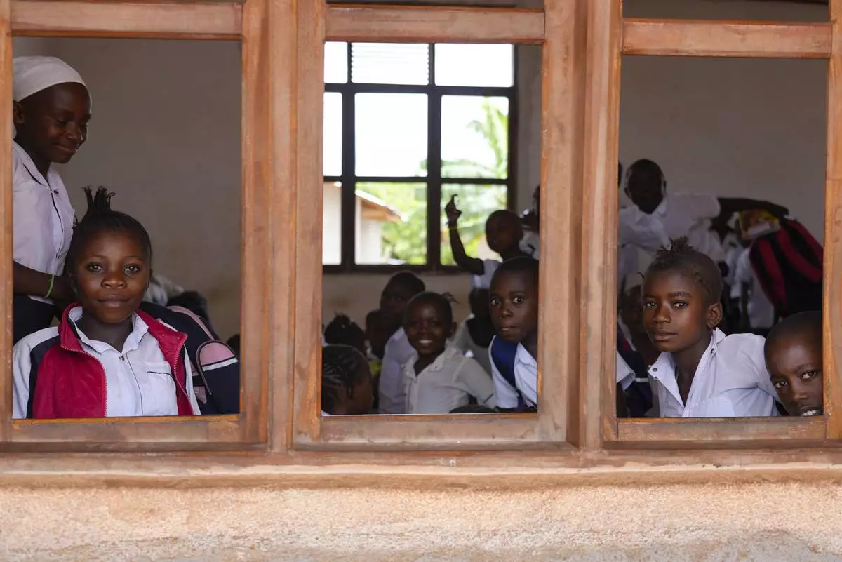 Children sit in a classroom with no windowpanes, built by a Chinese mining company, Kimia Mining, in Badengaido town in Congo, Sept. 23, 2024. (AP Photo/Sam Mednick)